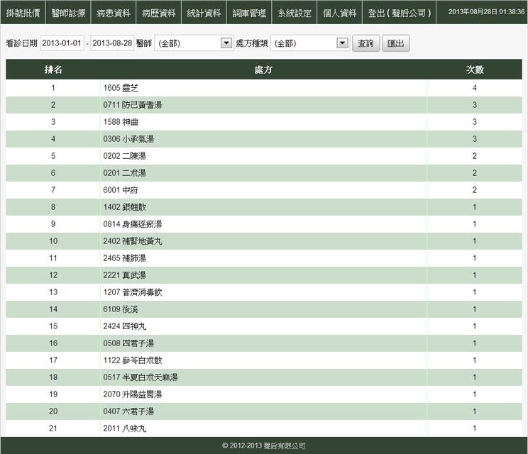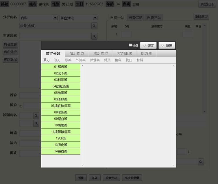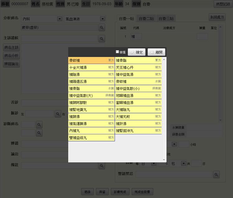 - 系統處方:顯示資料參考「張步桃醫方思維、張步桃藥方妙解、順天堂藥品要覽、針灸配穴、生藥臨床應用、中藥精華、中國方藥學、中藥藥理學、台灣民間藥、簡明藥材學」