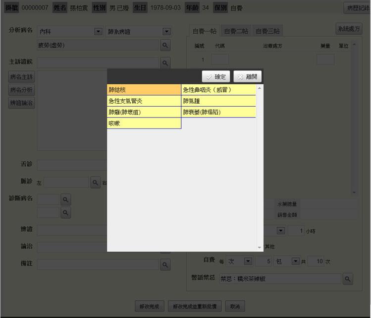 - 病名:輸入關鍵字或注音碼,點選「查詢鍵」,即出現病名選單。